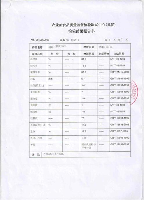 米率73.2%,整(zhěng)精米率66.5%,粒長6.7毫米,長寬比3.4,堊白粒率7%,堊白度1.0%,透明度1級,堿消值7.0級,膠稠(chóu)度70毫米,直鏈澱粉含量(liàng)17.6%。