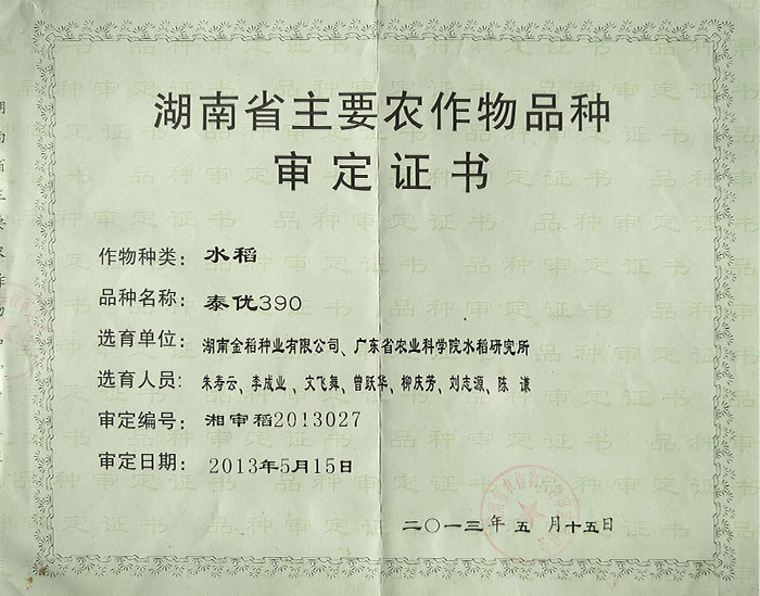 湖南省主要農作物品種審定證書